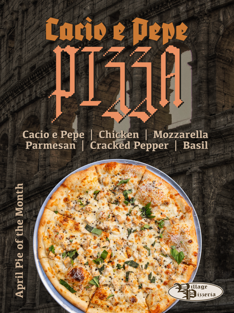 Cicao e peppe, Chicken, Mozzarella, Parmesan, Cracked Pepper, Basil.